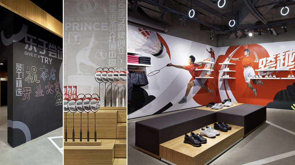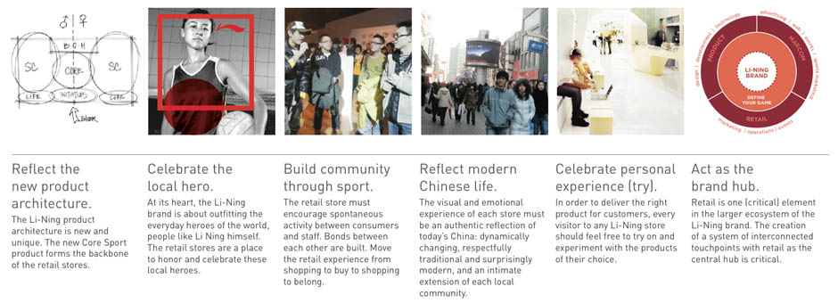 During my time at Ziba Design in Portland, Oregon, our work with Li-Ning spanned three years and was focused on consumer research, product, retail and brand. I was the principal Creative Director and contributing designer for the visual expression of the Li-Ning brand, which included: identity research, logo development, brand story, collateral and packaging, environmental graphics, and visual guidelines. I played a co-CD role on the retail store work, focusing on early experience strategy and framing, store concepts and design themes, and programmatic concepts and development.